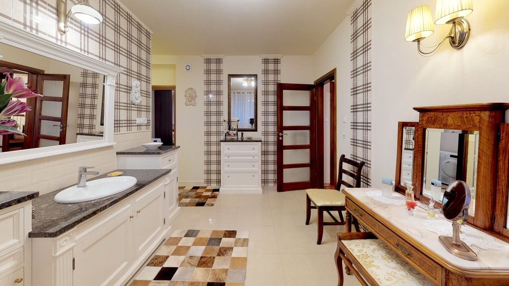 Na piętrze znajduje się hall, sypialnia główna z przejściem do łazienki, pokój pełniący funkcję gabinetu, pokój gościnny z wydzieloną pralnią, którą można przerobić na garderobę. Znajduje się na nim również ogólnodostępna łazienka. Wysokość pomieszczeń wynosi 280 cm.