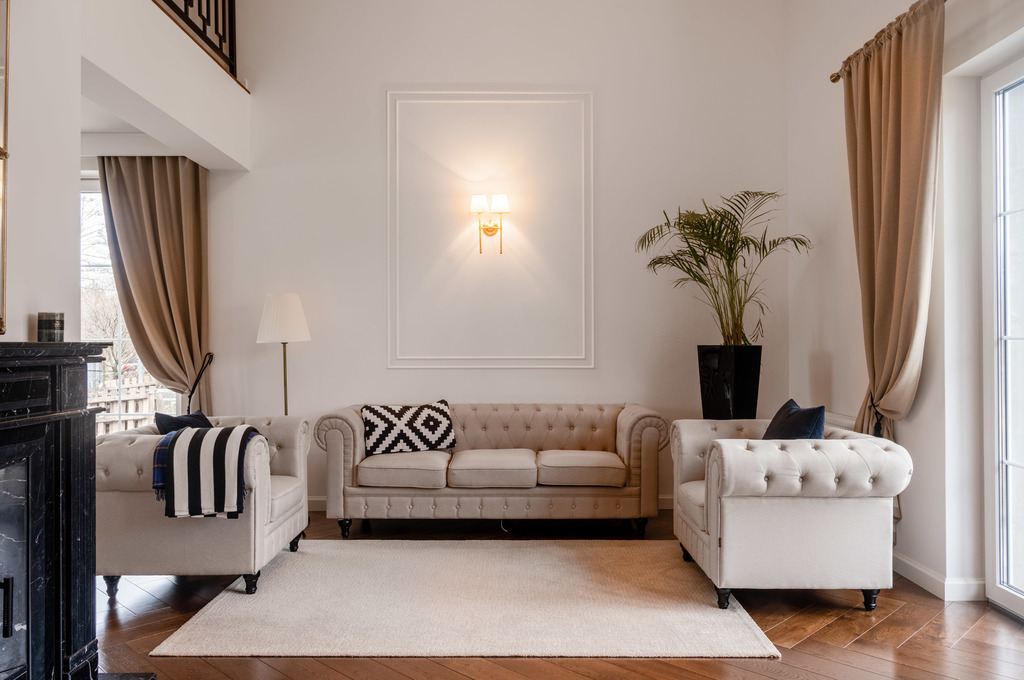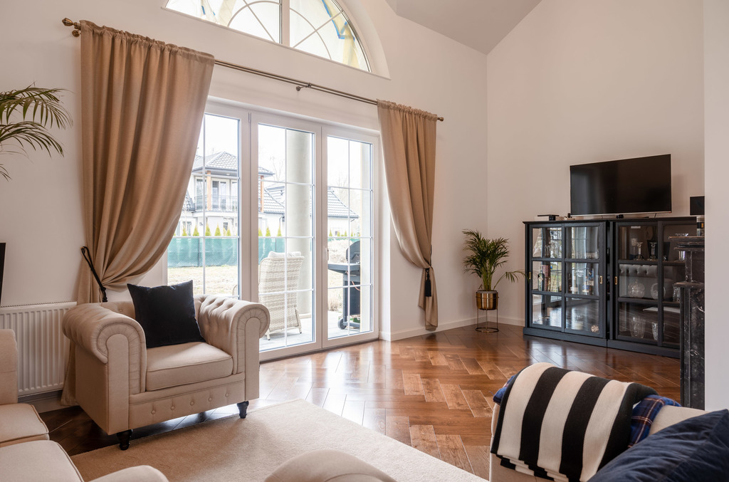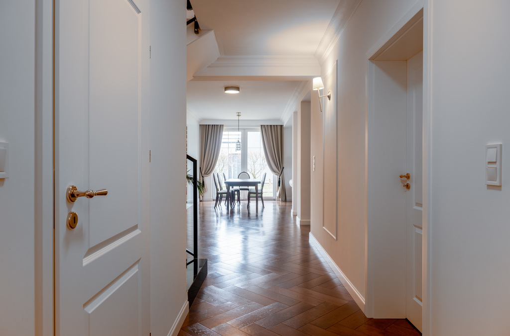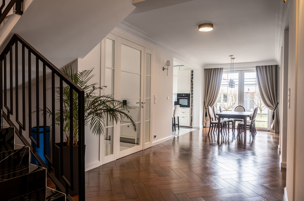 Dom ma wygodny układ pomieszczeń, który podzielony jest na część dzienną (parter) oraz część prywatną (piętro). Wnętrze domu urządzone w stylu lat 20, utrzymane w jasnych kolorach. Wnętrze domu dopracowane, wykończone przy użyciu materiałów i sprzętów wysokiej jakości.