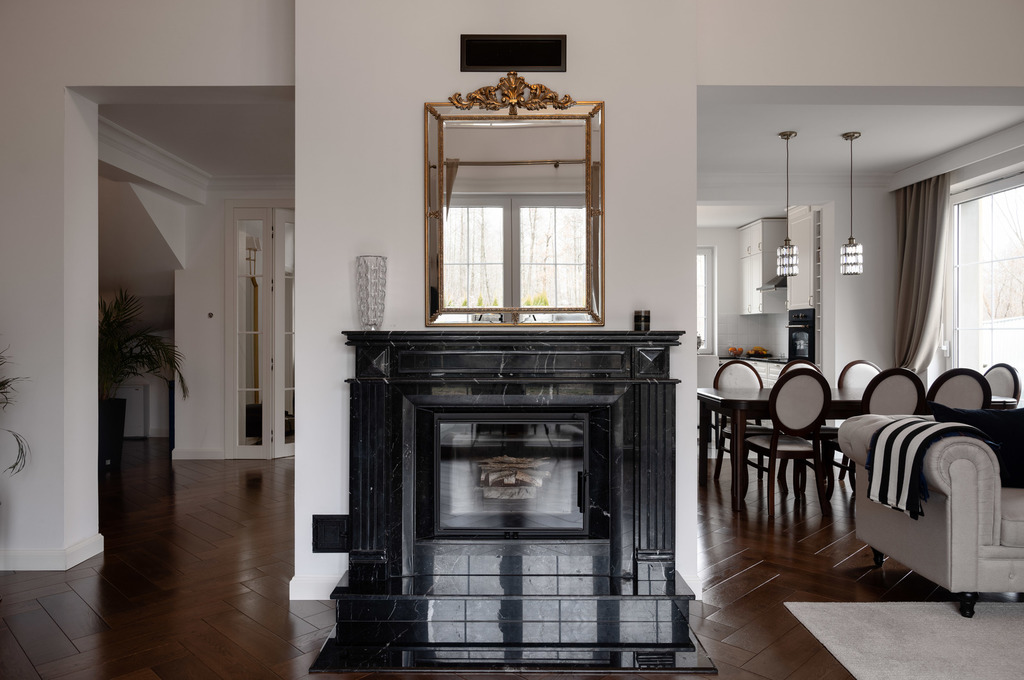● duży salon z kominkiem i wyjściem na taras - 26 m.kw.;
